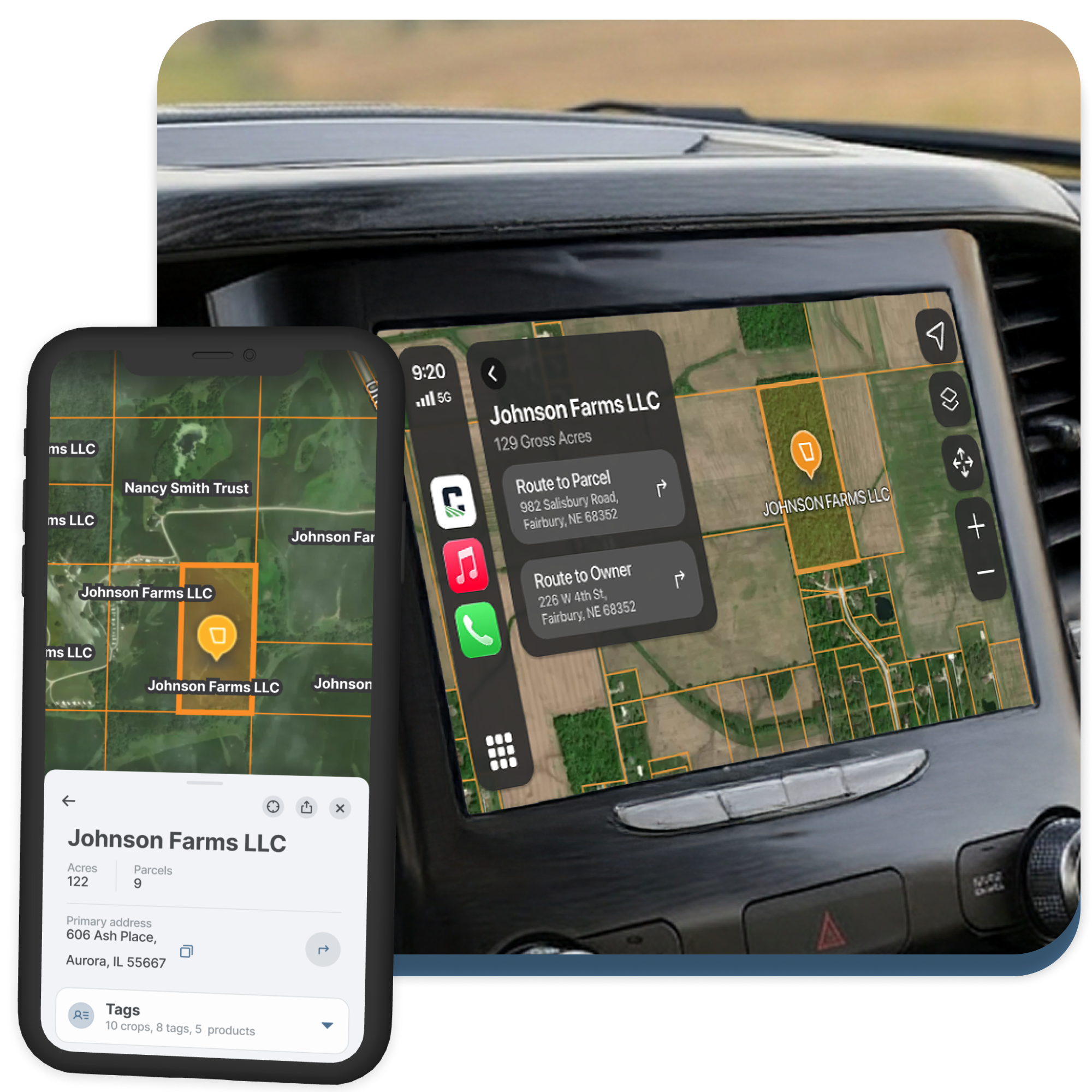 The CamoAg iOS app with CarPlay puts all of your producers in your pocket and on your truck screen. Easily find mapped locations, access contact and farm info, and see property lines and ownership records.