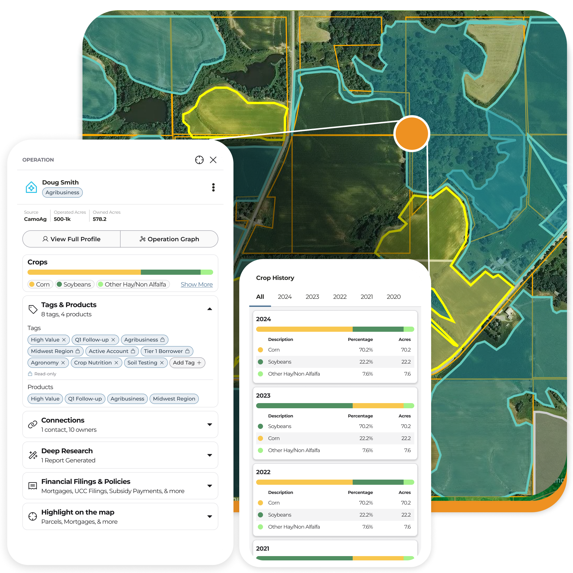 Search across one-million USÂ farm operations and quickly access detailed information such as aggregated owned acres, approximate operation size, crop history, location information, and more.
